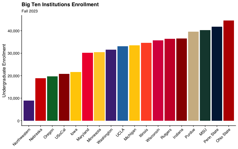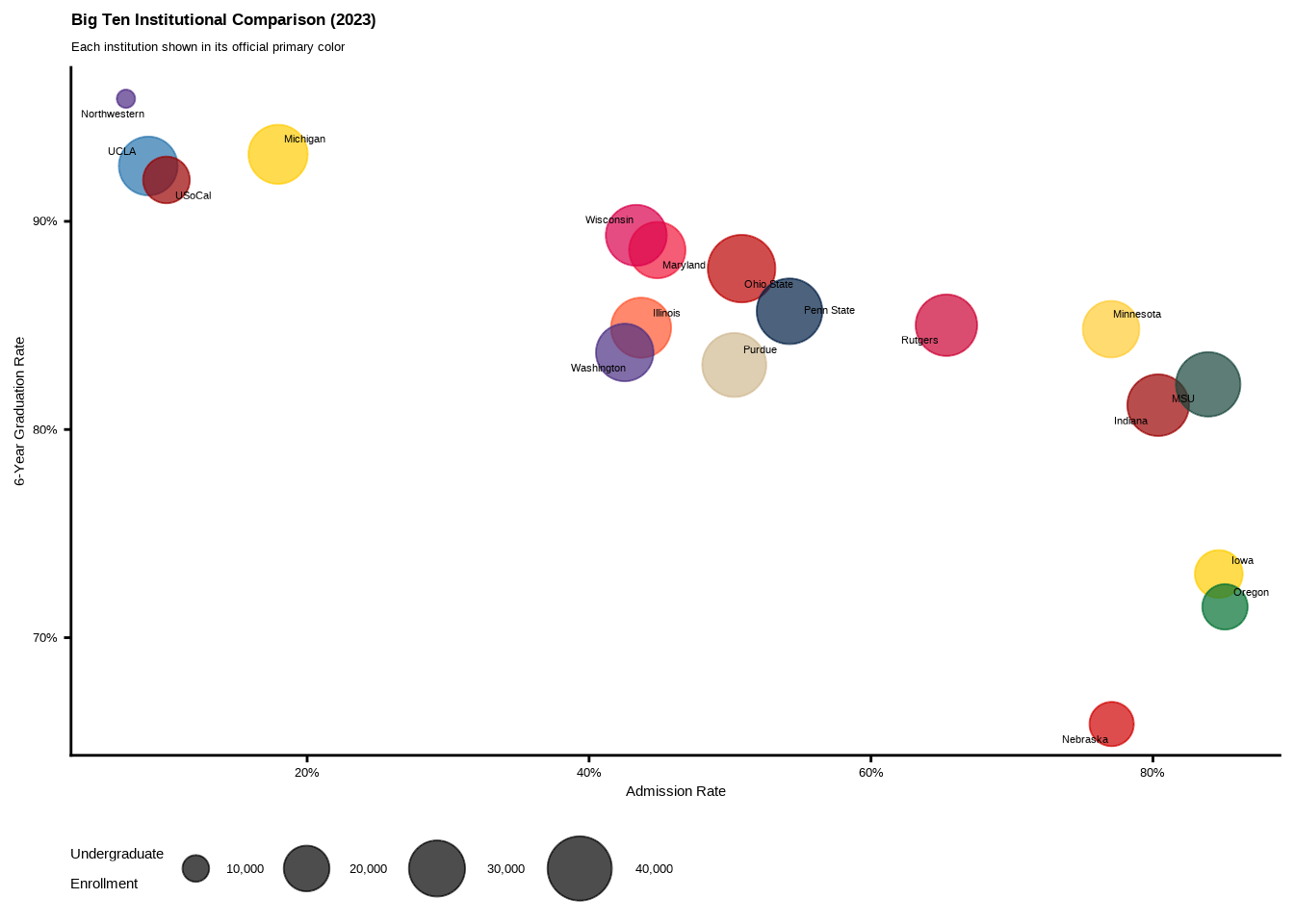 The packages include MSU-specific palettes (sequential, diverging, and qualitative) aligned with MSU’s branding guidelines, use the Metropolis font in plot construction, and provide primary and secondary colour palettes for all 18 Big Ten institutions - making them ideal for multi-institutional comparisons and collaborative research visualizations.